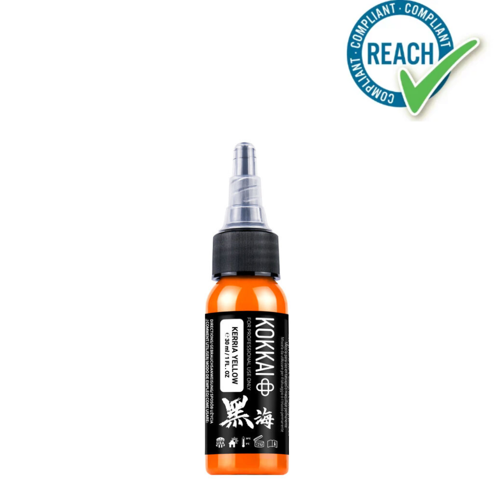 A Kerria Yellow Tattoo Ink a Kokkai Sumi Inks-től a hagyományos japán sumi tinta-készítés mesterségét ötvözi a modern tetoválófesték-gyártás precizitásával, hogy egy ragyogó, narancssárgás-sárga pigmentet hozzon létre.
